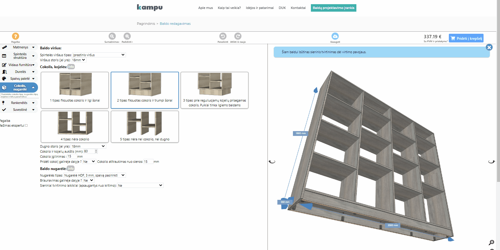 Norėdami keisti cokolį (apatinę spintos dalį) iš kairiojo meniu pasirinkite „Cokolis, nugarėlė“