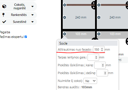 Norėdami koreguoti apatinę dalį (cokolį) užveskite pelę ant dantračio ženkliuko, esančio baldo apačioje. Tuomet pasirinkite skiltį „Atitraukimas nuo fasado“ bei suveskite tą pačią vertę, kokią vedėte prie pertvaros.