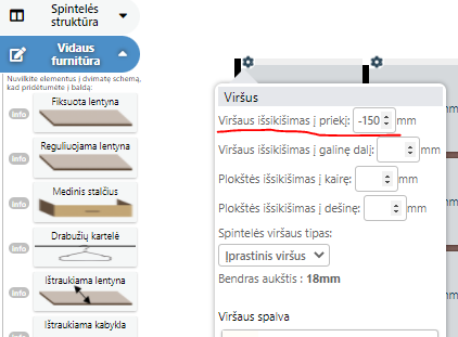 Norėdami koreguoti viršutinę plokštę, užveskite pelę ant dantračio ženkliuko, esančio prie viršutinės baldo plokštės, pasirinkite skiltį „Viršaus išsikišimas į priekį“ ir suveskite tą pačią vertę, kokią vedėte pertvaroje, tik šiuo atveju vertė turės būti neigiama.